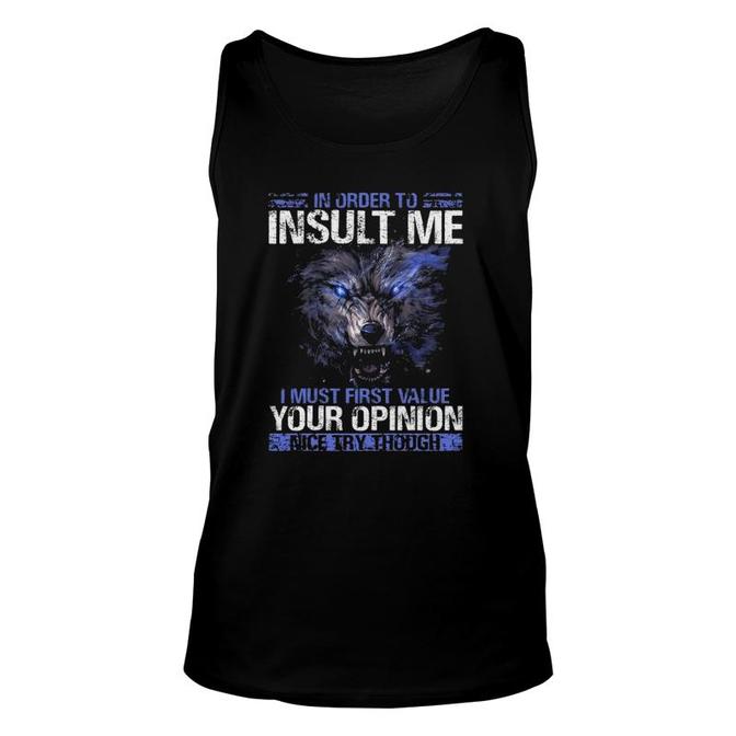 In Order To Insult Me I Must First Value Your Opinion Nice Try Through Sarcastic Wolf Tank Top