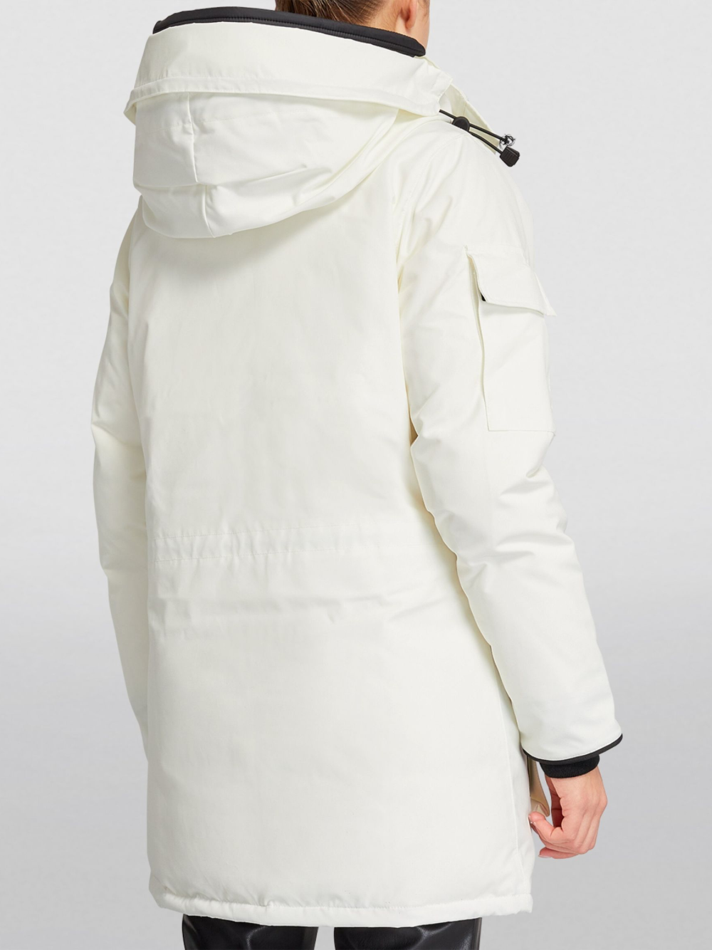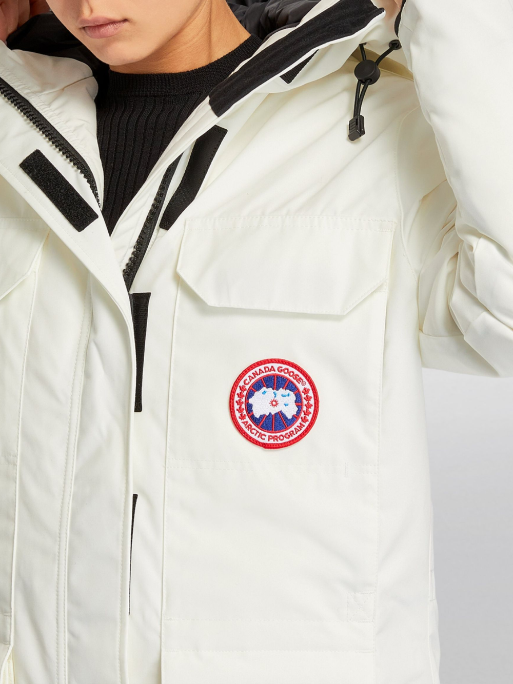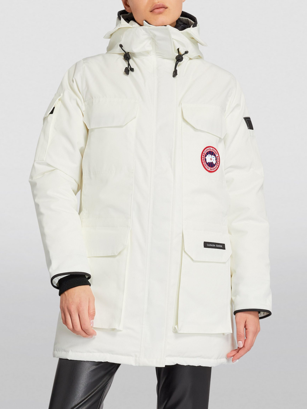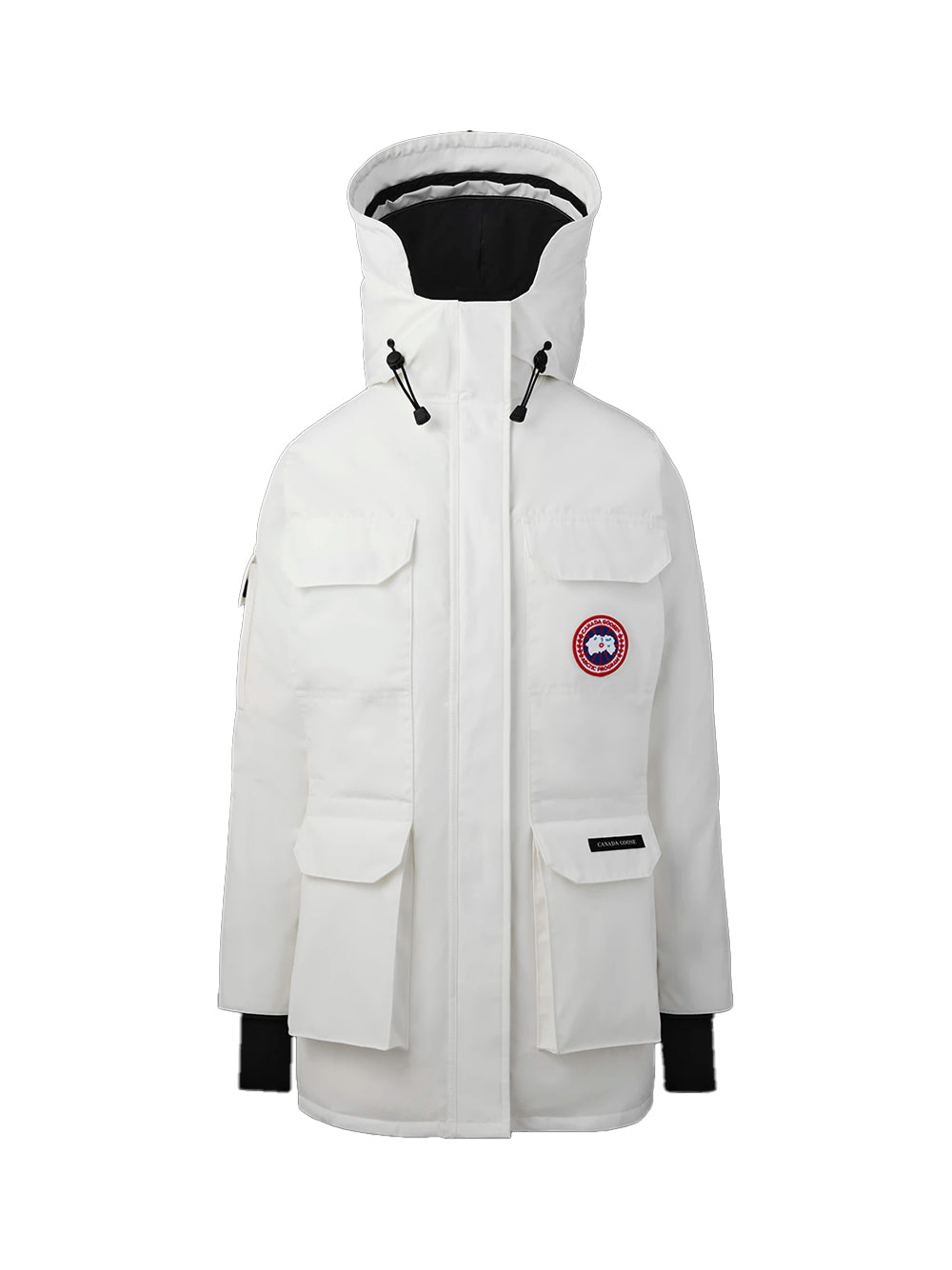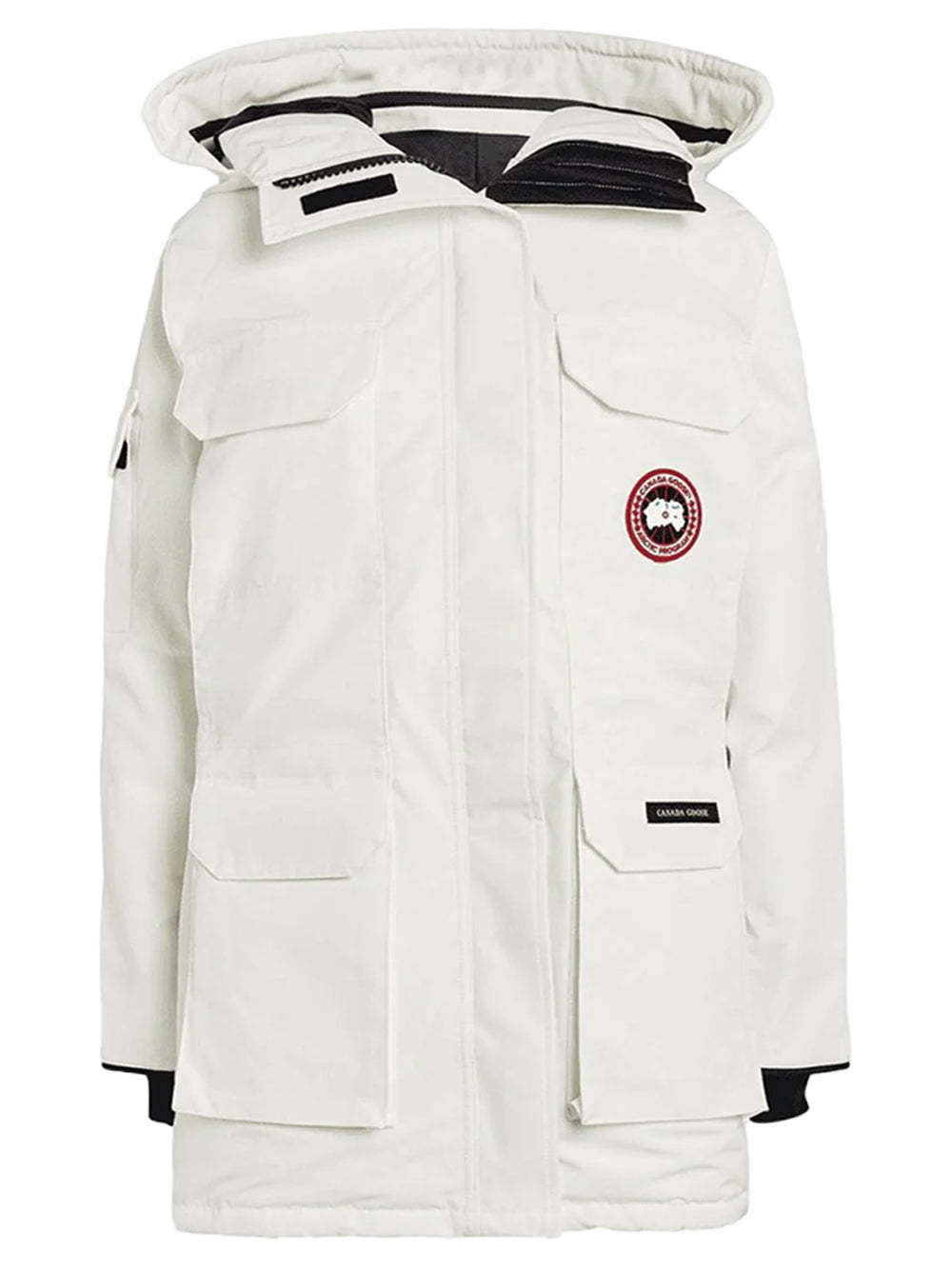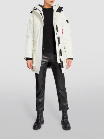 The Canada Goose Expedition Parka North Star White is a technical and -style coat with an adjustable down hood and tricot chin guard. This -inspired design adds Expedition webbing, internal waist drawcord and recessed rib cuffs. A -style snow skirt, Velcro storm placket and four zip pockets complete protection.