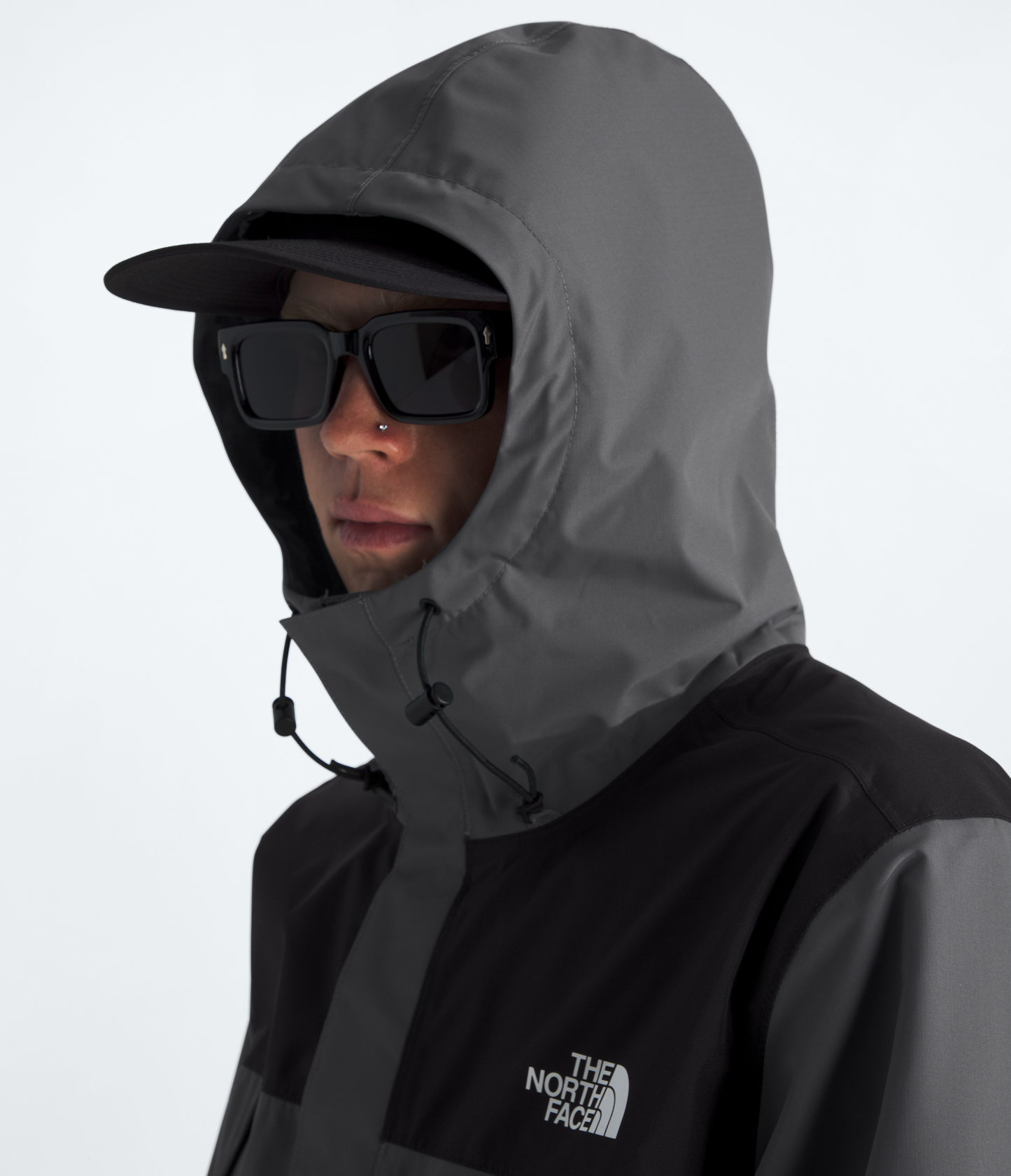 - Attached, adjustable, three-piece hood with a cinch-cord with cord locks